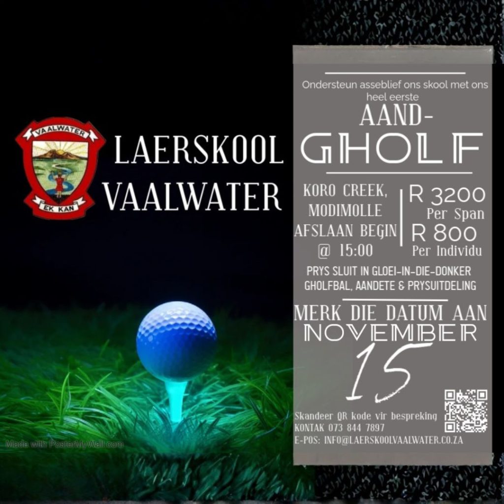 Kom geniet ’n onvergeetlike aand vol pret, ligte, en gholf — alles ter ondersteuning van Laerskool Vaalwater! Hierdie unieke Aandgholf-geleentheid bied die perfekte geleentheid om jou gholfvaardighede te wys, saam met vriende te kuier, en terselfdertyd ’n verskil te maak.