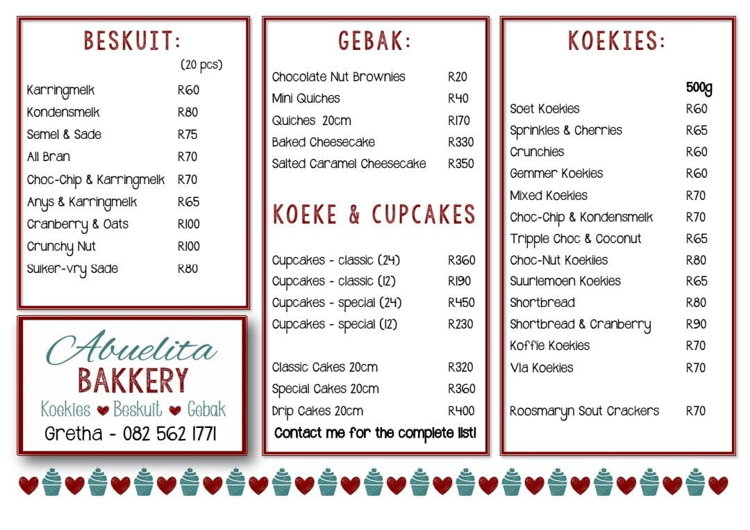 I offer homemade baked goodies to the Ellisras area. We have a variety of delicious rusks, cookies,
