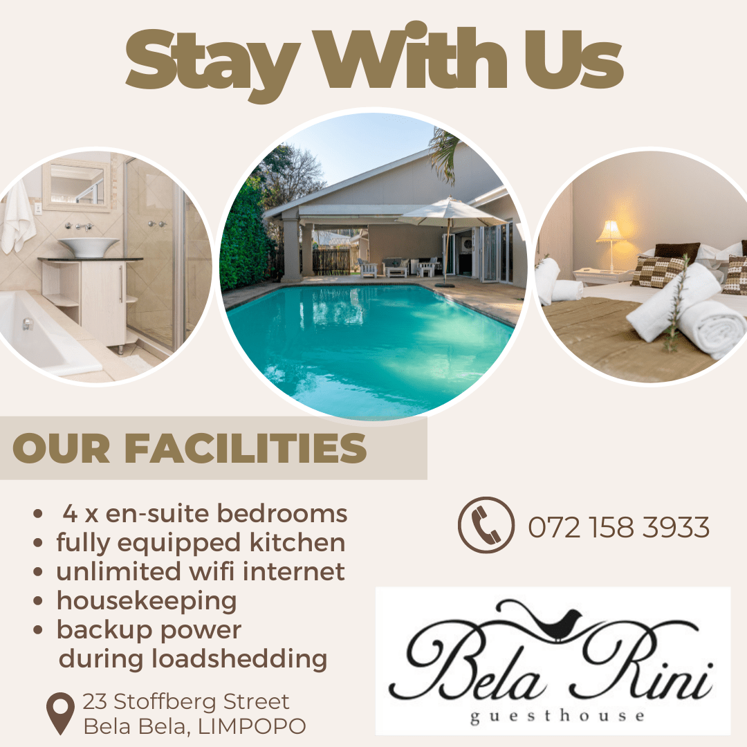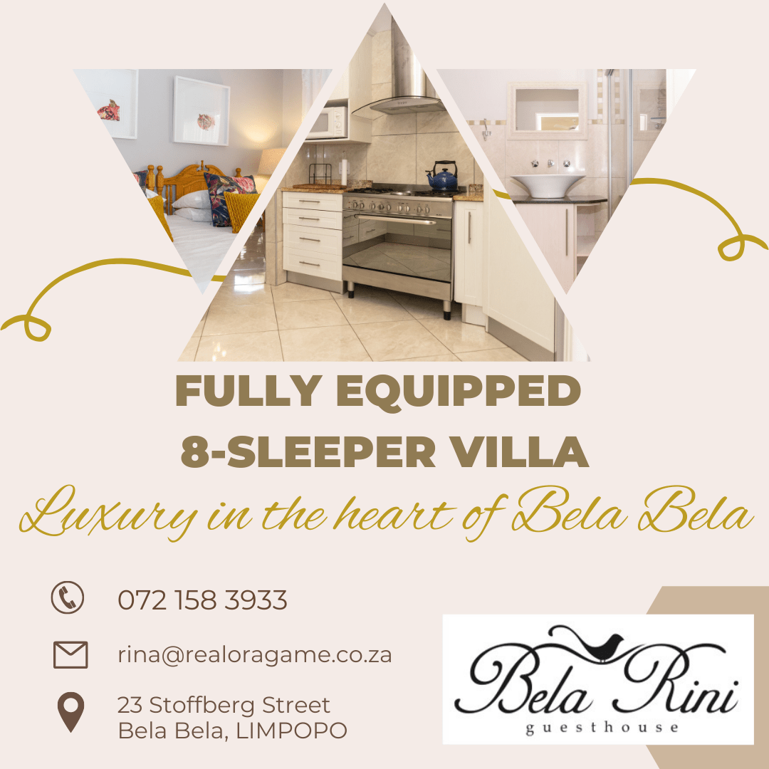 Bela Rini Guesthouse is an 8-sleeper villa based in the town of Bela Bela. It offers: