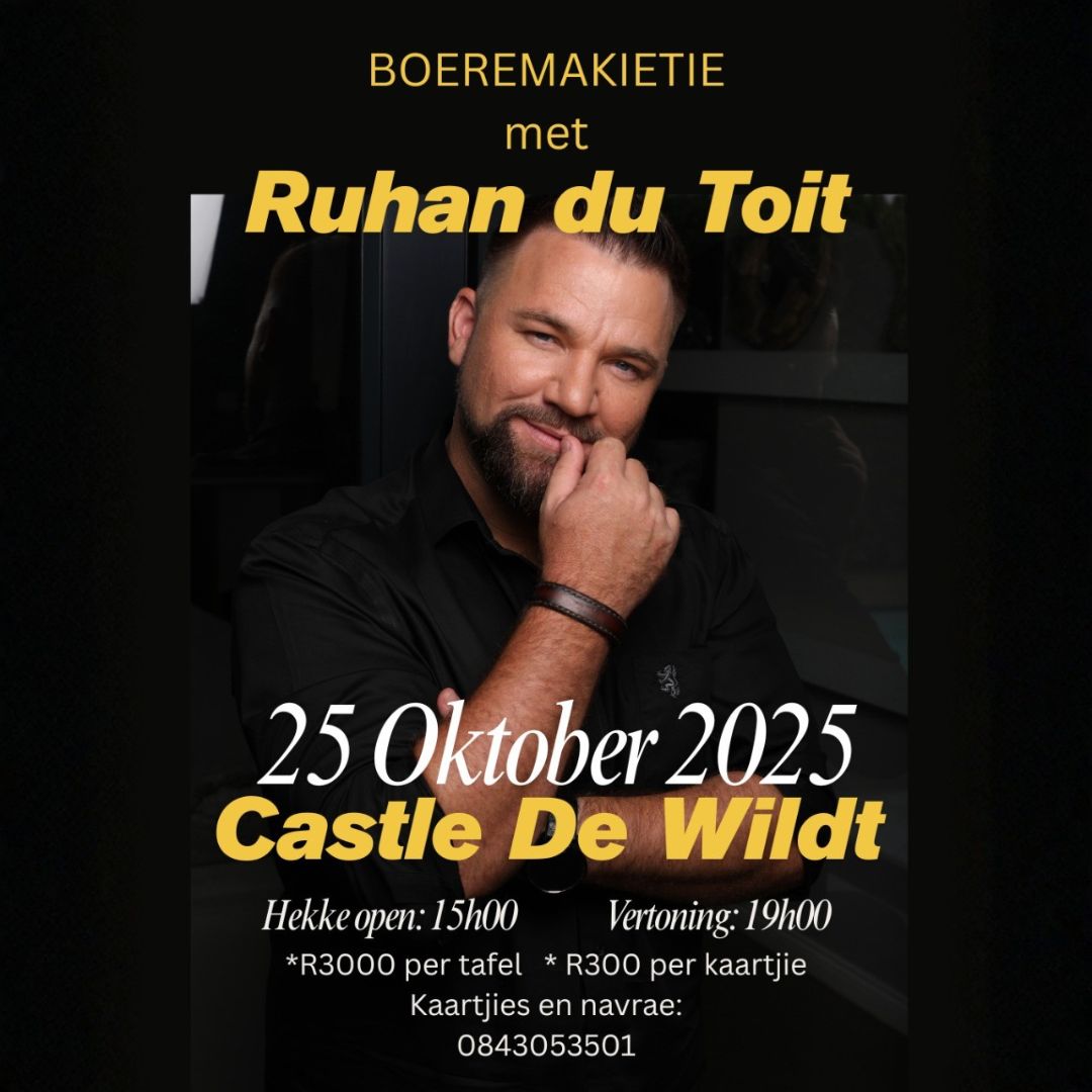 Hekke open: 15h00 | Vertoning: 19h00 *R3000 per tafel * R300 per kaartjie