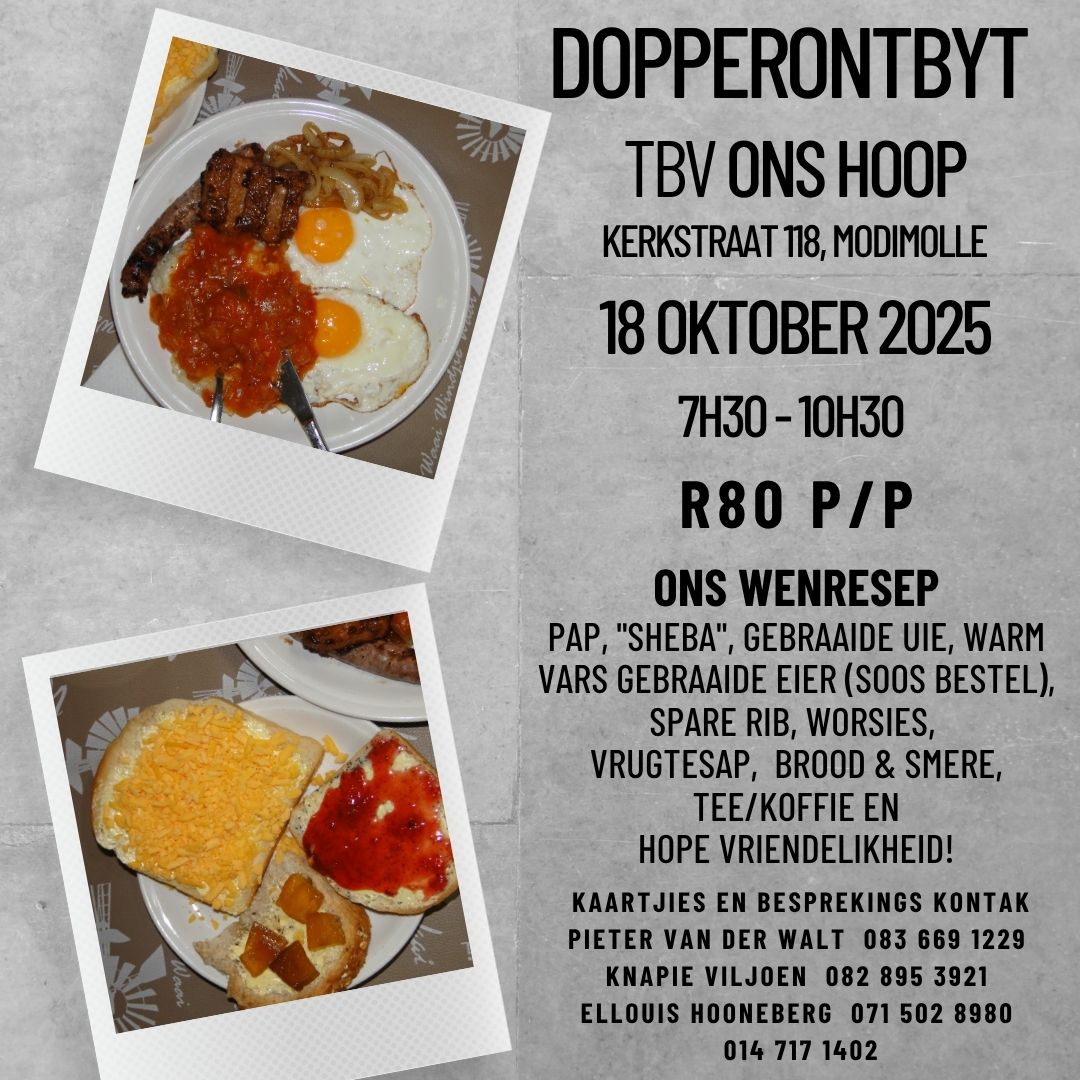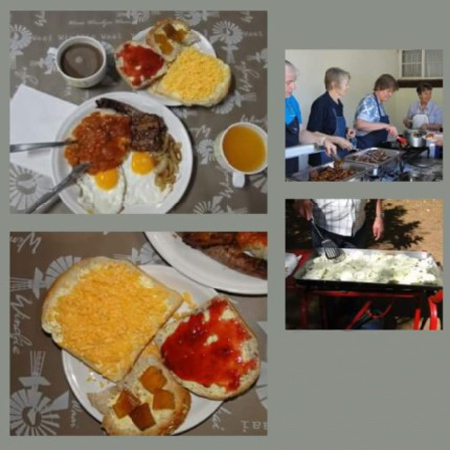 Pap, "sheba", gebraaide uie, warm vars gebraaide eier (soos bestel), vark-ribbetjie,