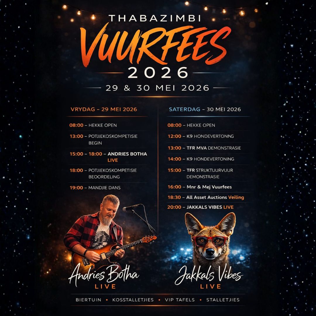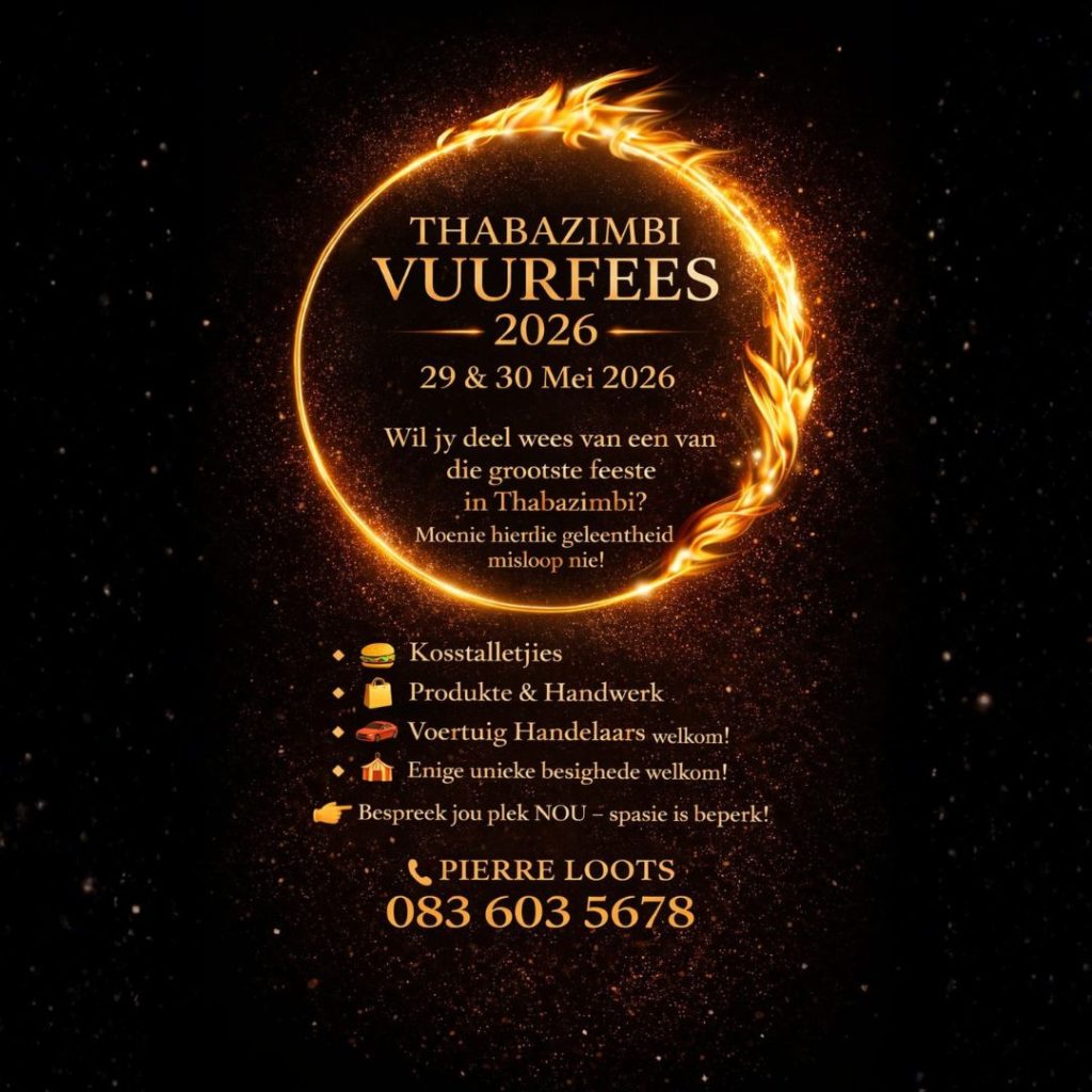 Aansoekvorms vir stalletjies moet na Thaba Fire & Rescue voor 26ste April 2026 gestuur word: Thaba Fire & Rescue (TFR) – Email: thaba reandrescue@gmail.com of Whatsapp na: Madelein (TFR Admin): 083 601 8019