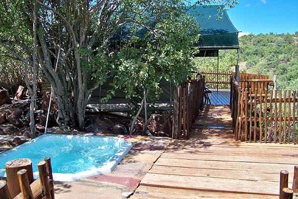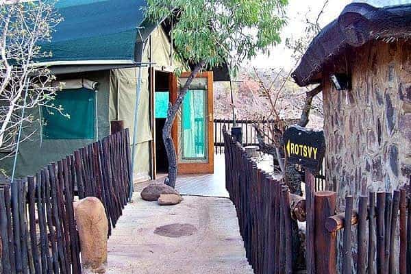 The Panorama & Rotsvy Safari Tents  feature one room with double bed and one room with four single beds. Each unit has full bathroom and shower amenities, large equipped kitchen, braai lapa, sundowner deck and a six seater Jacuzzi. The two tents respectively sleep up to six guests comfortably.  At Panorama one additional “chopper” tent can be erected, if required, which will allow for a total of eight guests to be accommodated.